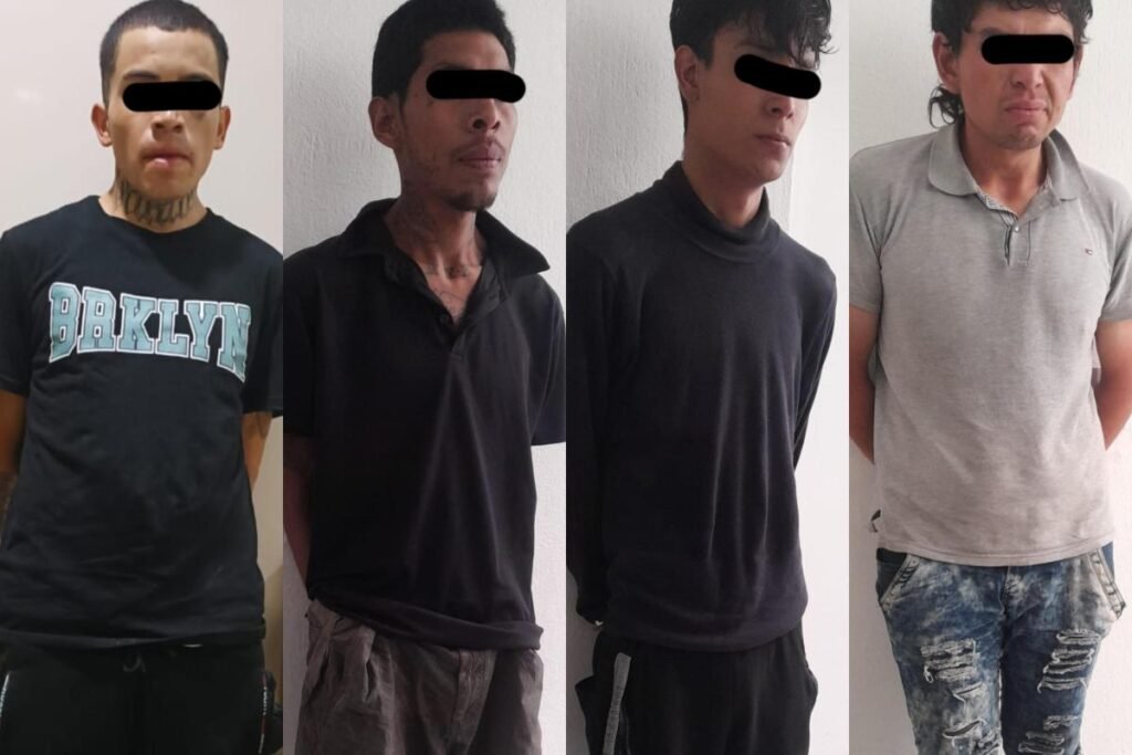 ECATEPEC. Edoméx. 10 de junio de 2024.- Cuatro sujetos relacionados con al menos 18 asaltos a tiendas OXXO en los municipios de Ecatepec y Coacalco, fueron detenidos en calles de la colonia Ejidos de San Cristóbal por elementos de la Dirección de Seguridad Pública y Tránsito de Ecatepec, luego de que fueron sorprendidos mientras portaban diversos envoltorios con hierba seca similar a la mariguana y una navaja plegable.